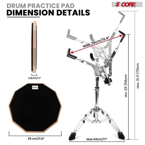 - HIGH GRADE SNARE DRUM STAND – Heavy duty with double-braced tripod, fits 8″-15.6″ diameter drum, height adjustable (23″ to 31″). Universal for adults and kids.